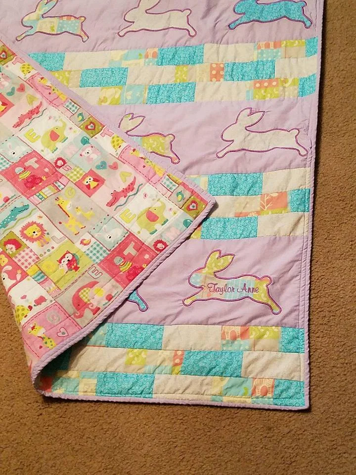 It holds a special place in my heart because it was the first baby girl quilt I made and it has the sweetest colors and bunnies! I also did some embroidery on it with baby girl’s name.
